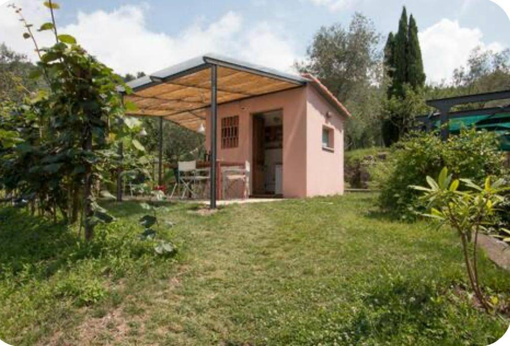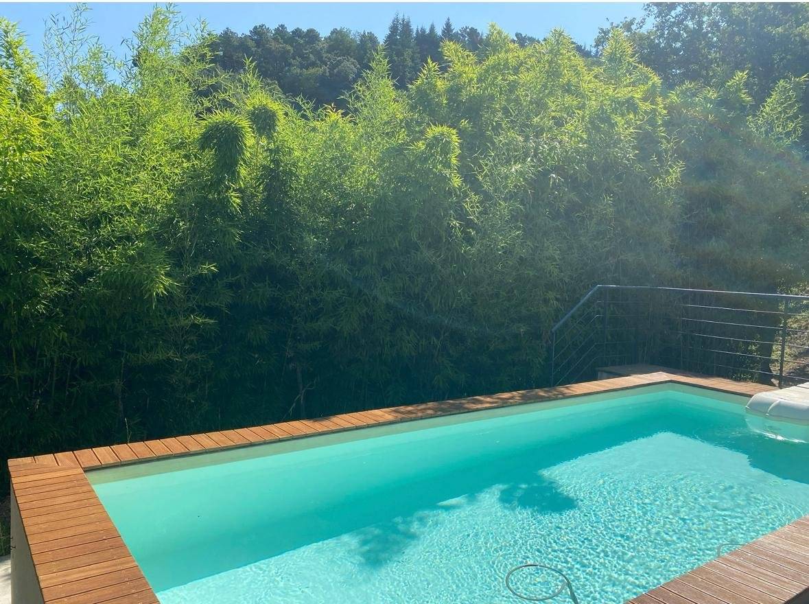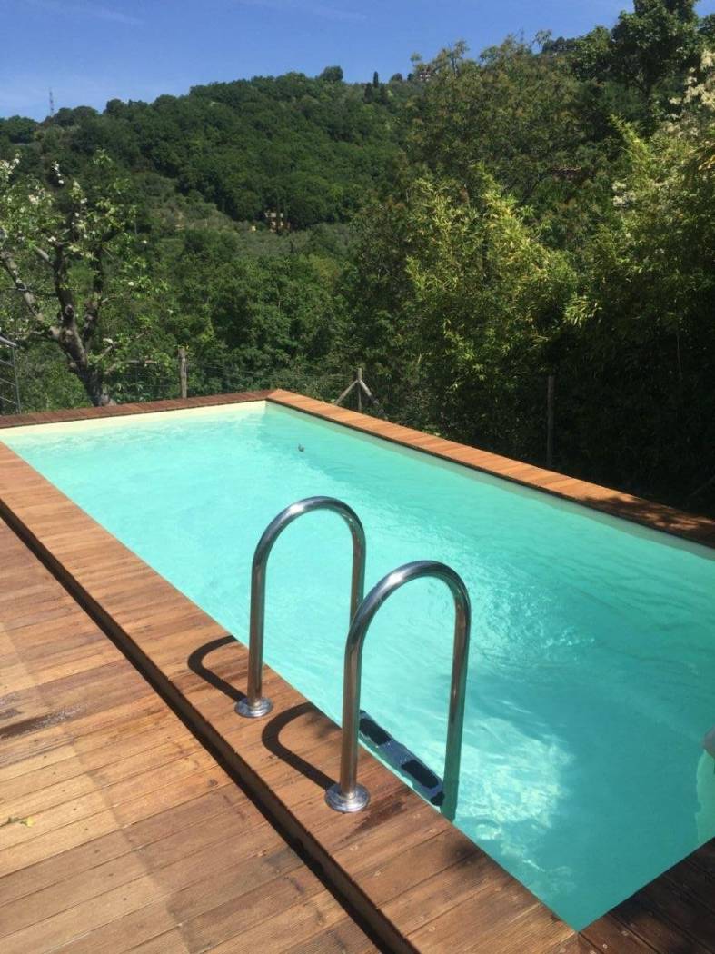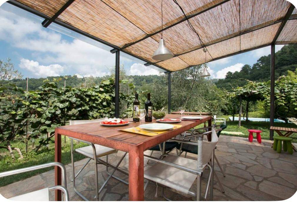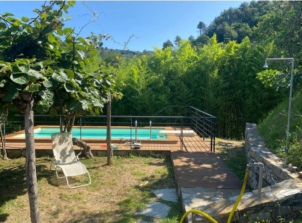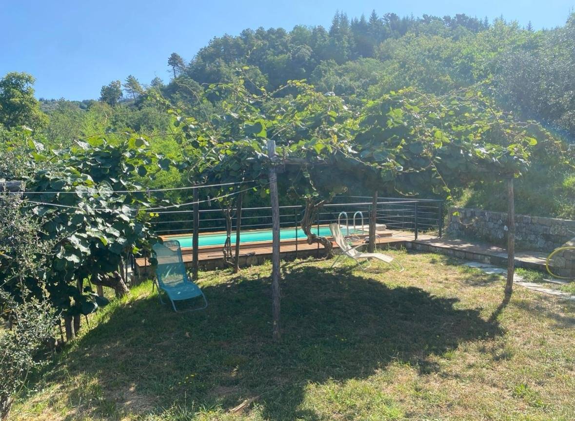 Accanto alla casa, una bella piana con una piccola piscina ed una cucina esterna con area coperta dove pranzare e cenare all'aperto.